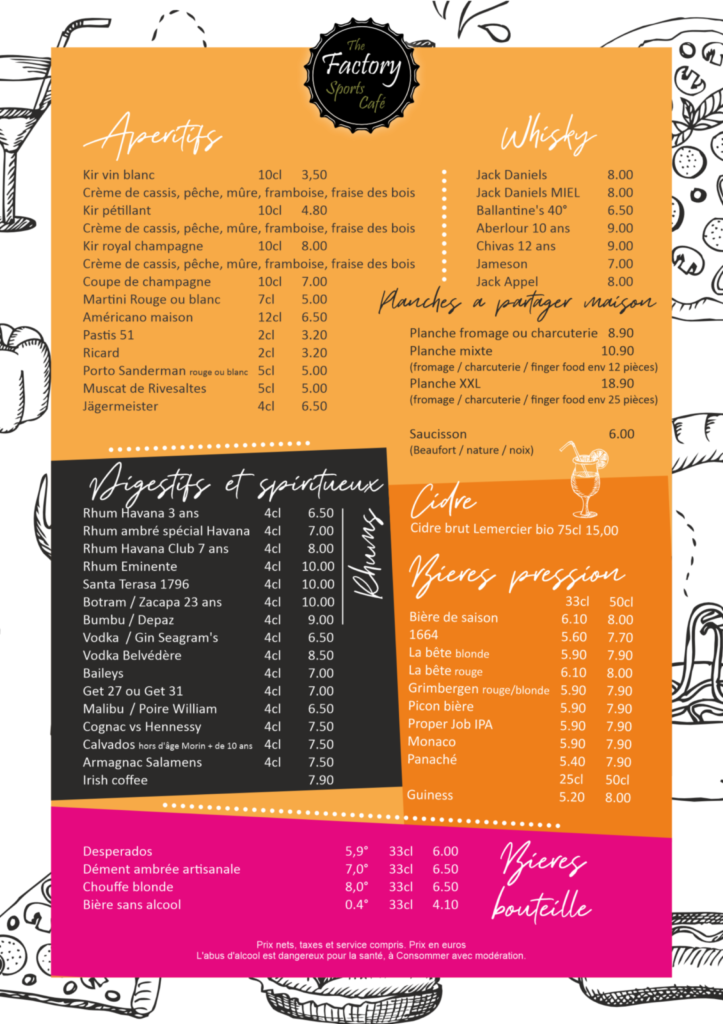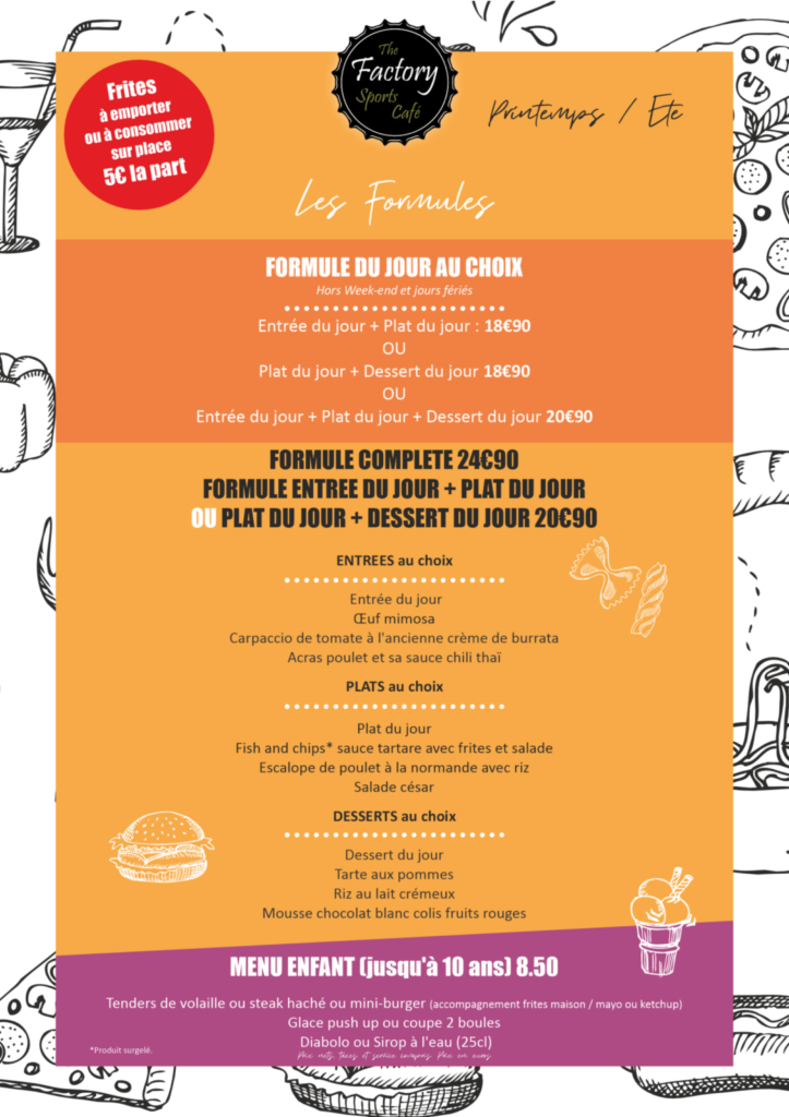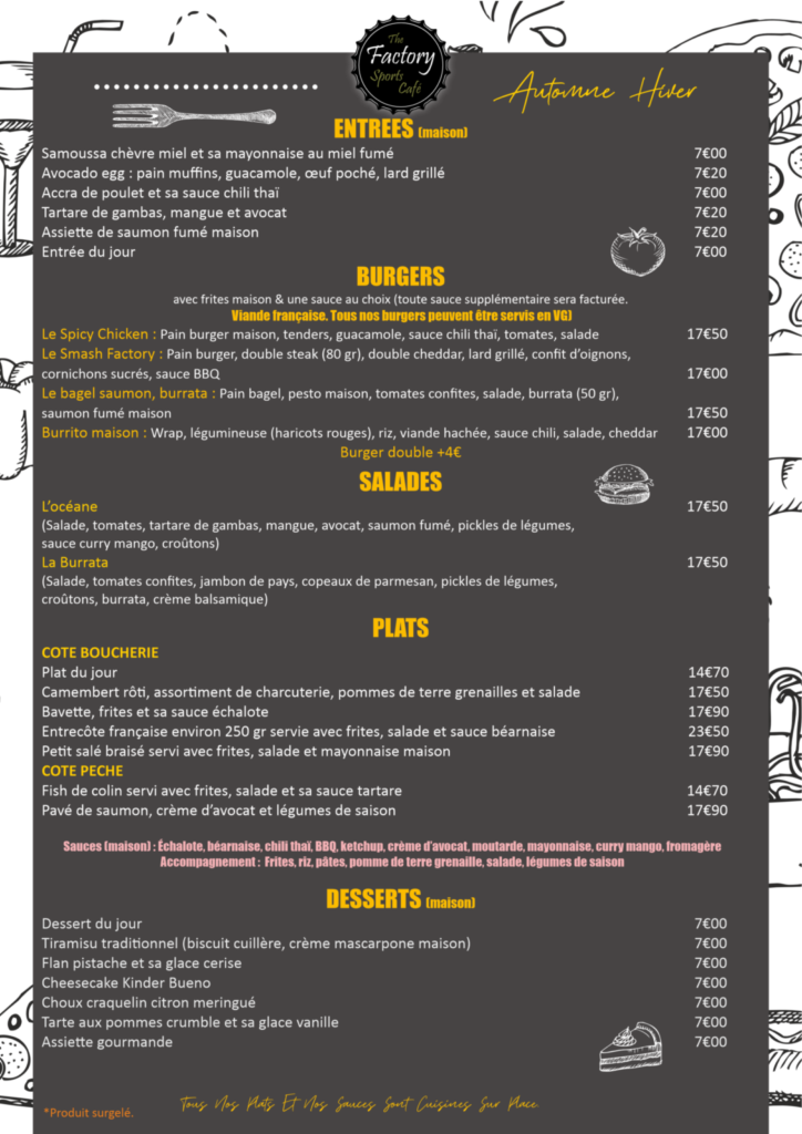 Du petit-déjeuner au moment de partage entre amis, collègues, famille et cela tout au long de la journée. Toute l'équipe du The Factory Sports Café vous reçoit tout au long de la journée.