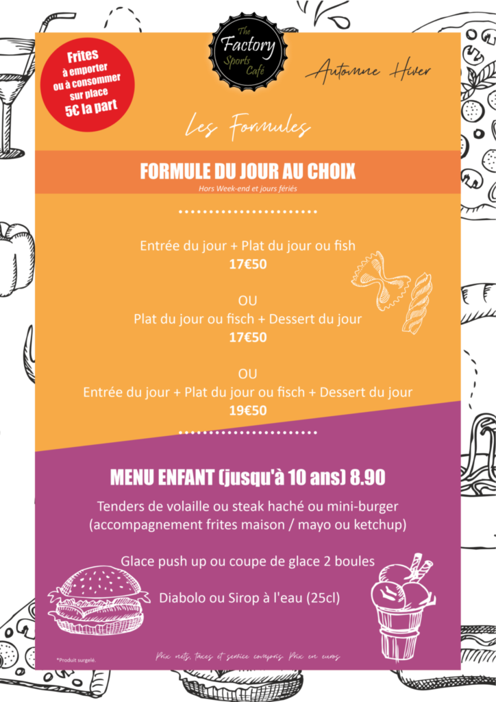Du petit-déjeuner au moment de partage entre amis, collègues, famille et cela tout au long de la journée. Toute l'équipe du The Factory Sports Café vous reçoit tout au long de la journée.